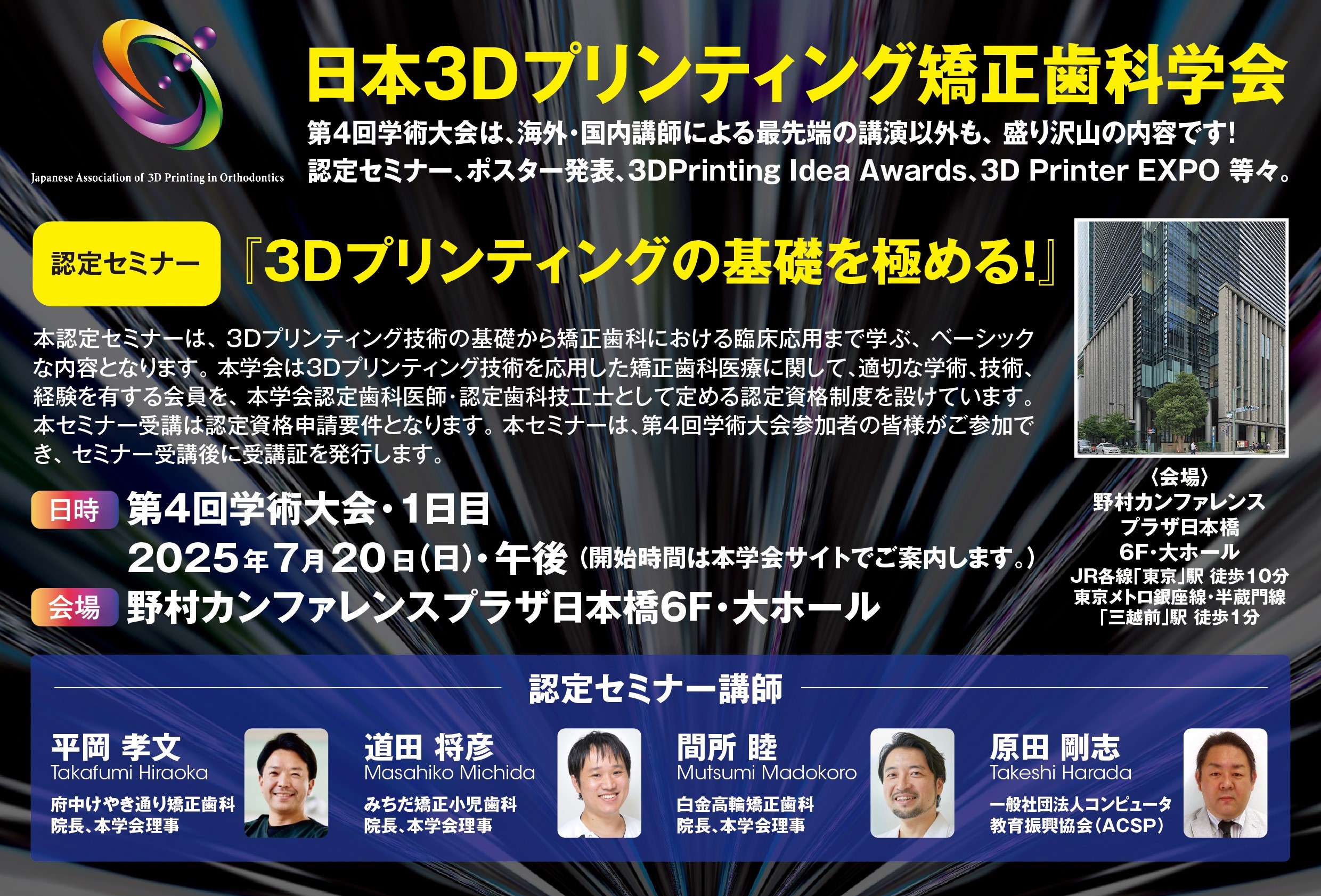 本セミナーは、3Dプリンティング技術の基礎から矯正歯科における臨床応用まで学ぶ、ベーシックな内容となります。